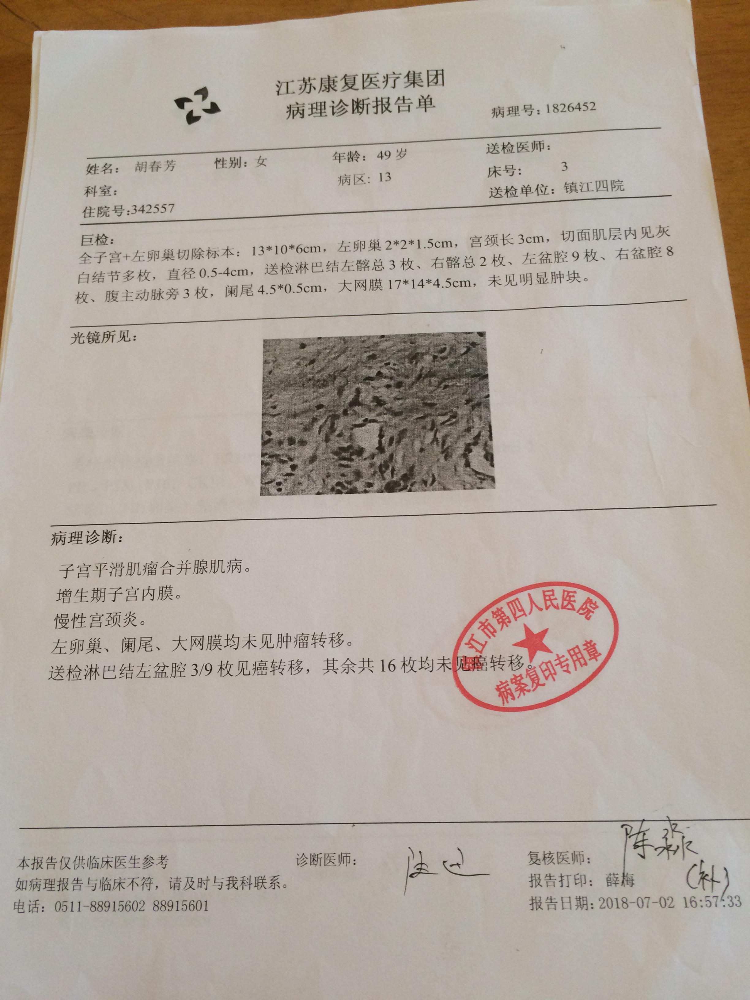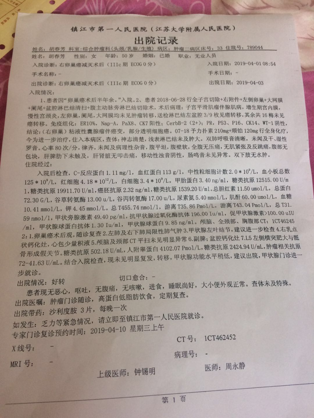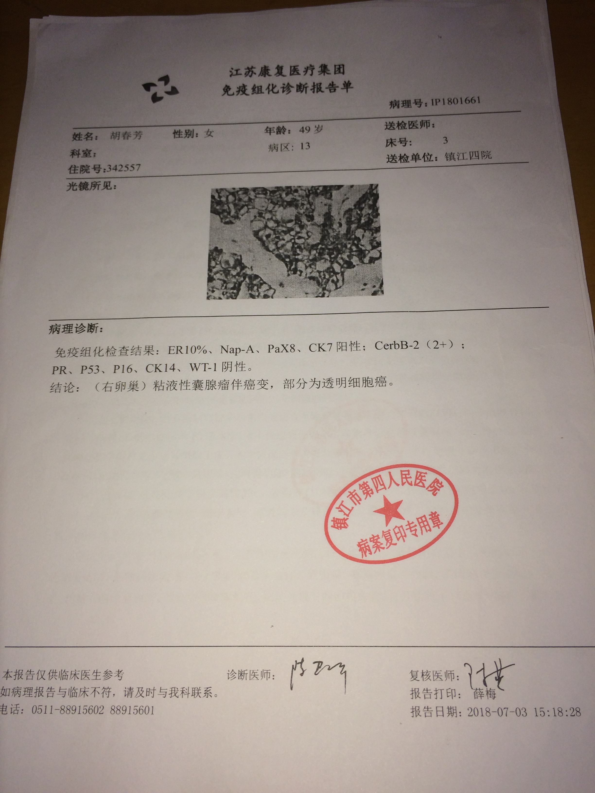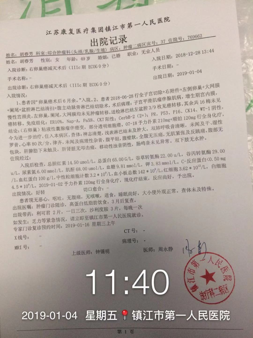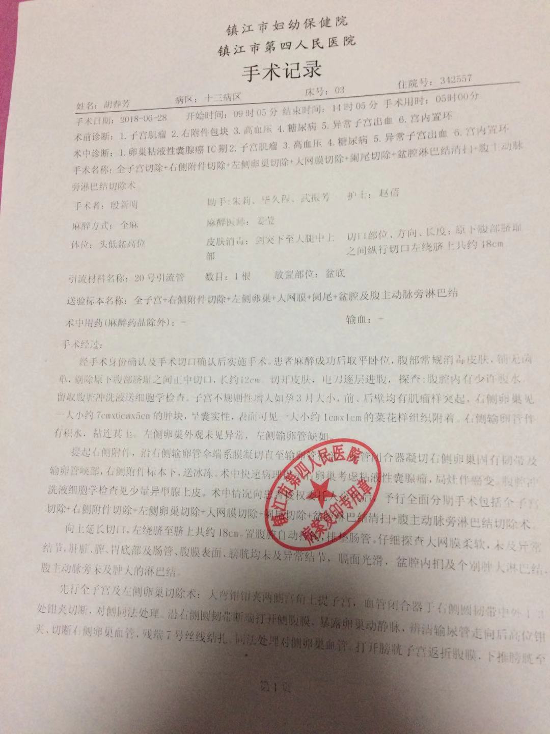 我叫胡春芳,江苏镇江人,卵巢癌3C期,送检淋巴结左盆腔3/9枚癌转移,卵巢癌粘液性囊腺癌合并透明细胞癌3C期,很严重,还有高血压糖尿病,2018年6月住院,降血糖在内分泌科,费用4千多,手术妇科全切除2万4,化疗已8个疗程16万,复发就要重复手术、化疗。现在筹款用于定期CT等检查、化验,抗癌药、靶向药,并为以后复发的化疗、手术筹资,希望好心人帮帮我,我想多活几年。